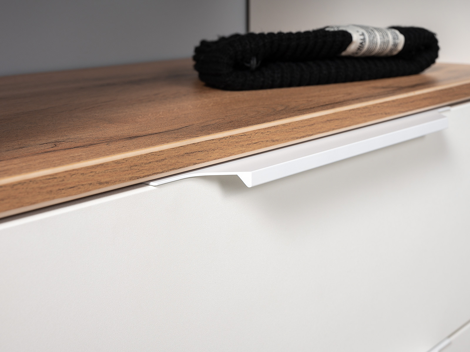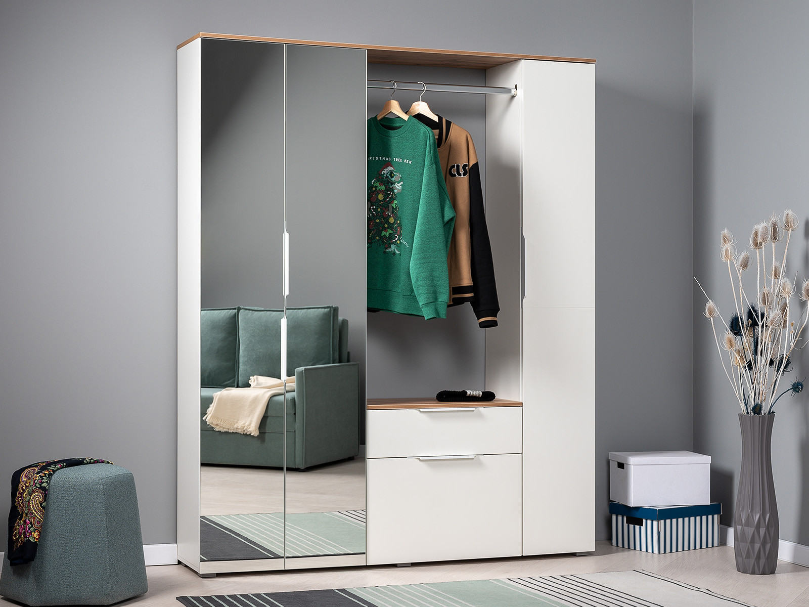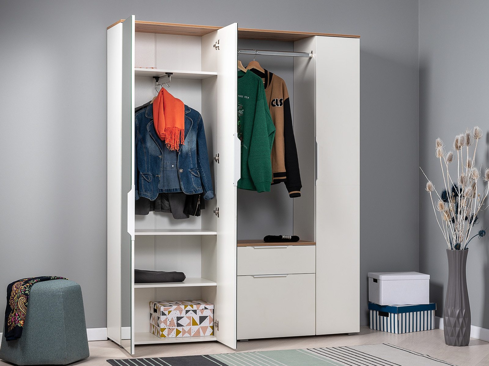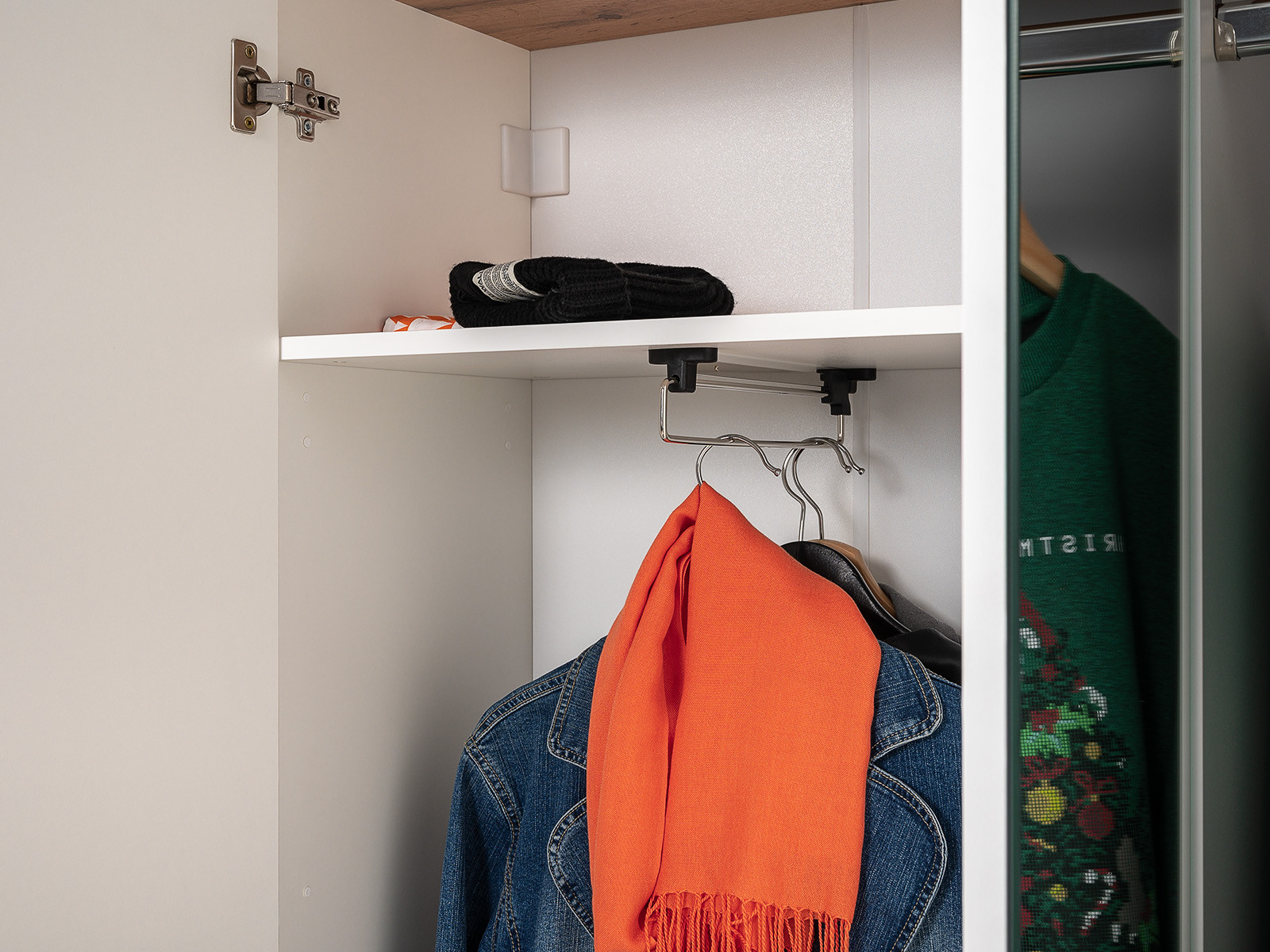 Фурнитура: Шариковые направляющие полного выдвижения, алюминиевые ручки, выдвижная вешалка