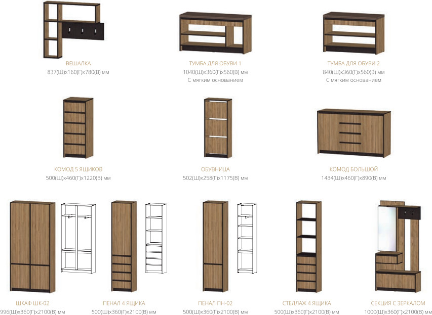 Цена за комплект: Вешалка, Комод 5 ящиков, Тумба для обуви 1, Пенал ПН-02