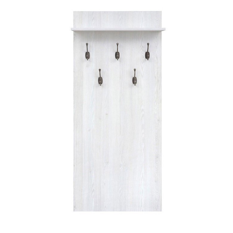 Вешалка представляет собой горизонтальный щит; На горизонтальный щит крепится полка и 5 металлических крючков; На стену крепится при помощи металлических кронштейнов для навешивания;
