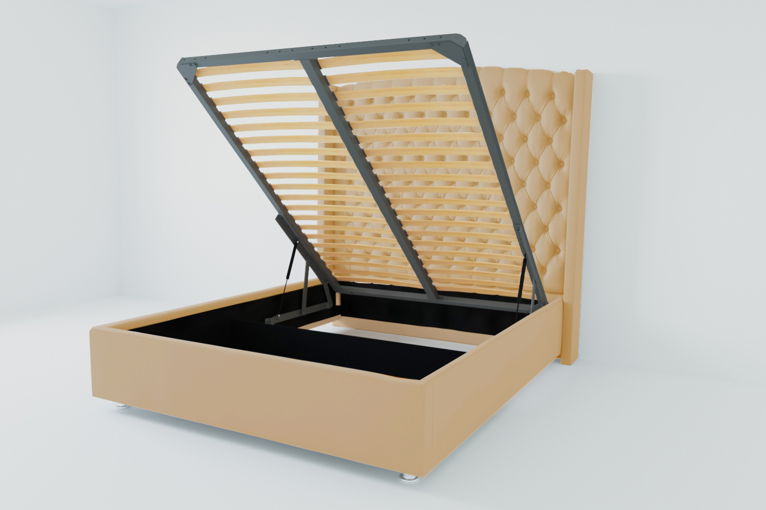 Короб для белья установлен в нижней половине кровати, ее верхнюю половину занимает подъемный механизм.
