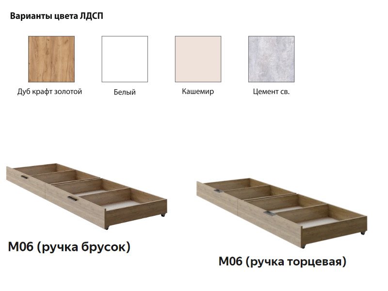 Цвета ящиков: Дуб крафт золотой, Белый, Кашемир, Цемент светлый