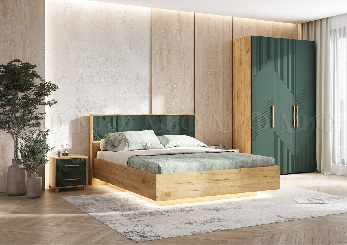 - Кровать парящая 1600 Ирис (ортопед дерево) Браш Мени Грин/Дуб Крафт