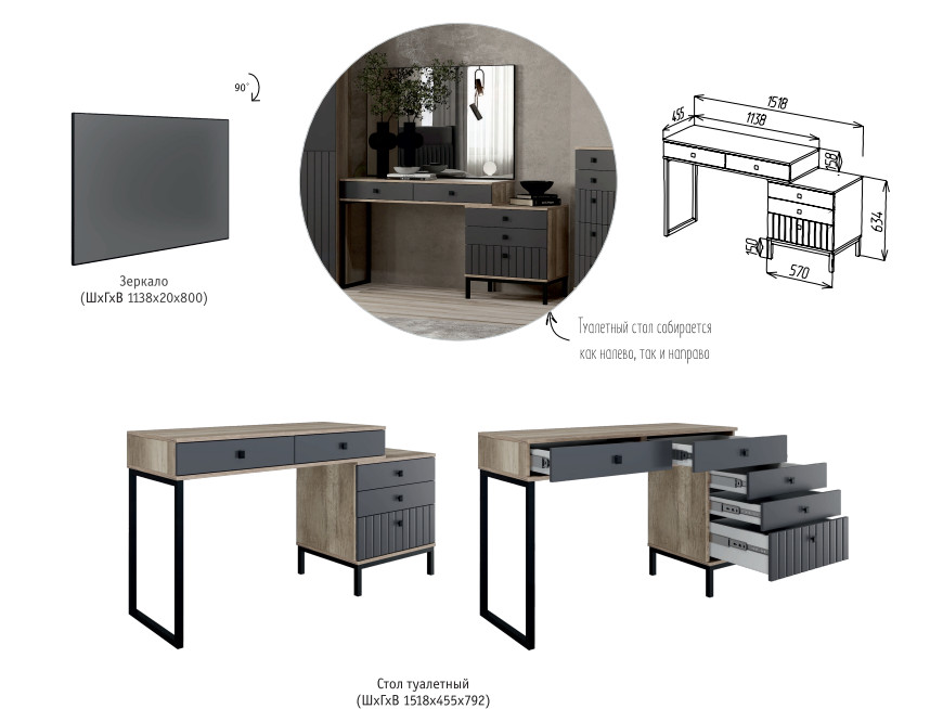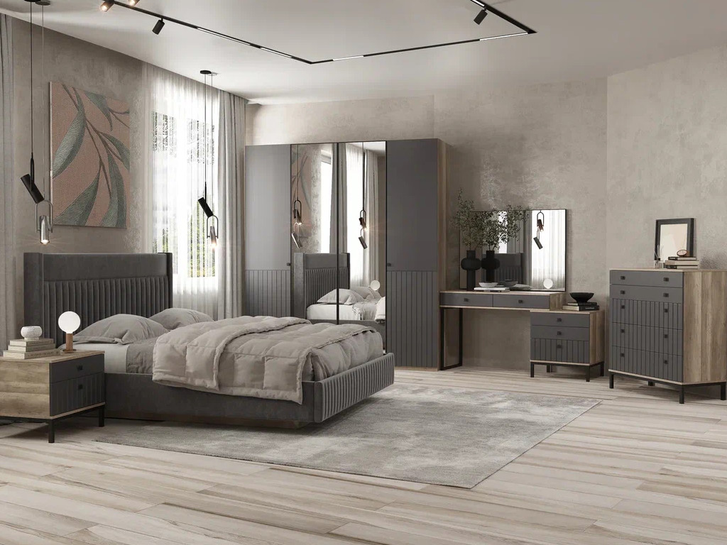 Цена за комплект: Тумба, Кровать (1600), Шкаф 4 двери (зеркало), Зеркало, Стол туалетный, Комод 5 ящиков