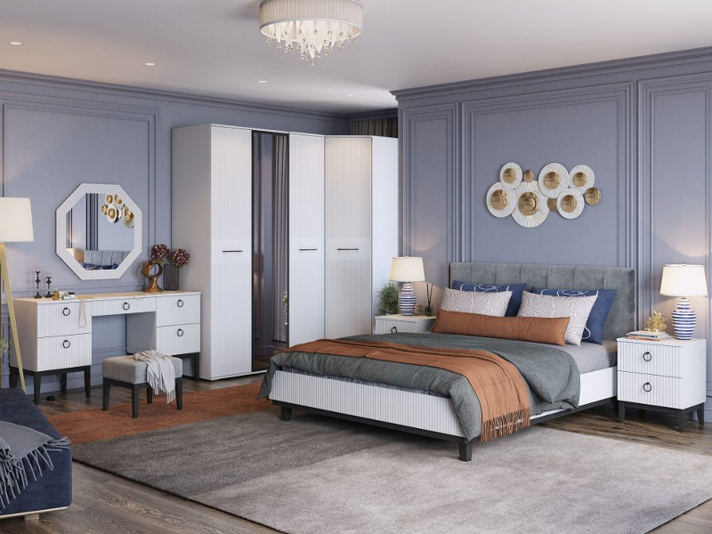 Цена за комплект: Кровать с мягк.изголовьем 1200, Основание для кровати ЛАЙТ 1200*2000мм, Тумба прикроватная (2 шт), Зеркало, Туалетный столик, Шкаф угловой, Шкаф 1дв. для платья и белья, Шкаф 2дв. для платья и белья (с зеркалом)