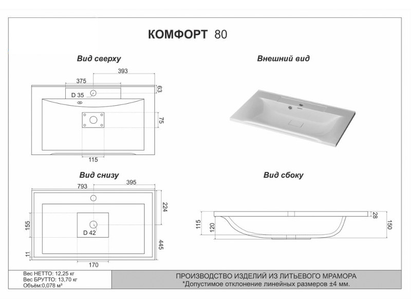 - Тумба Альба 80 подвесная 2 ящика раковина Комфорт 80 антрацит