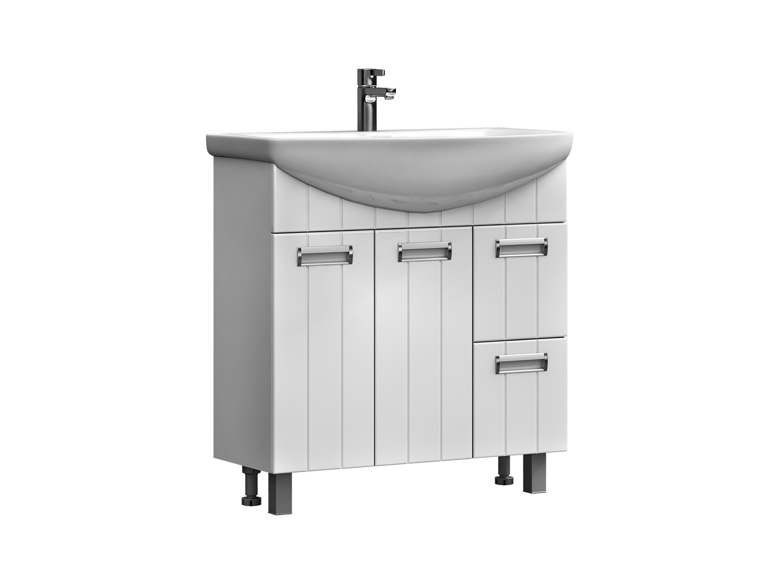 Оснащение: 1 дверца; 2 ящика; 1 полка ЛДСП; ручка металлическая хромированная, опоры квадратные регулируемые