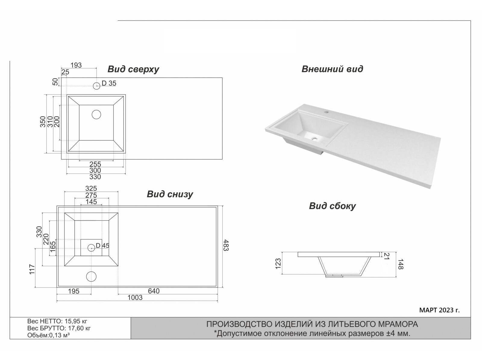 Размеры раковины: