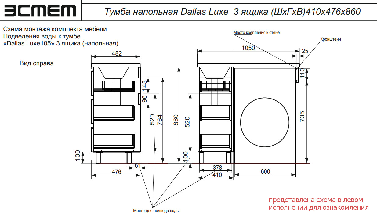 - Тумба с раковиной Dallas Luxe 1050 напольная 3 ящика правая