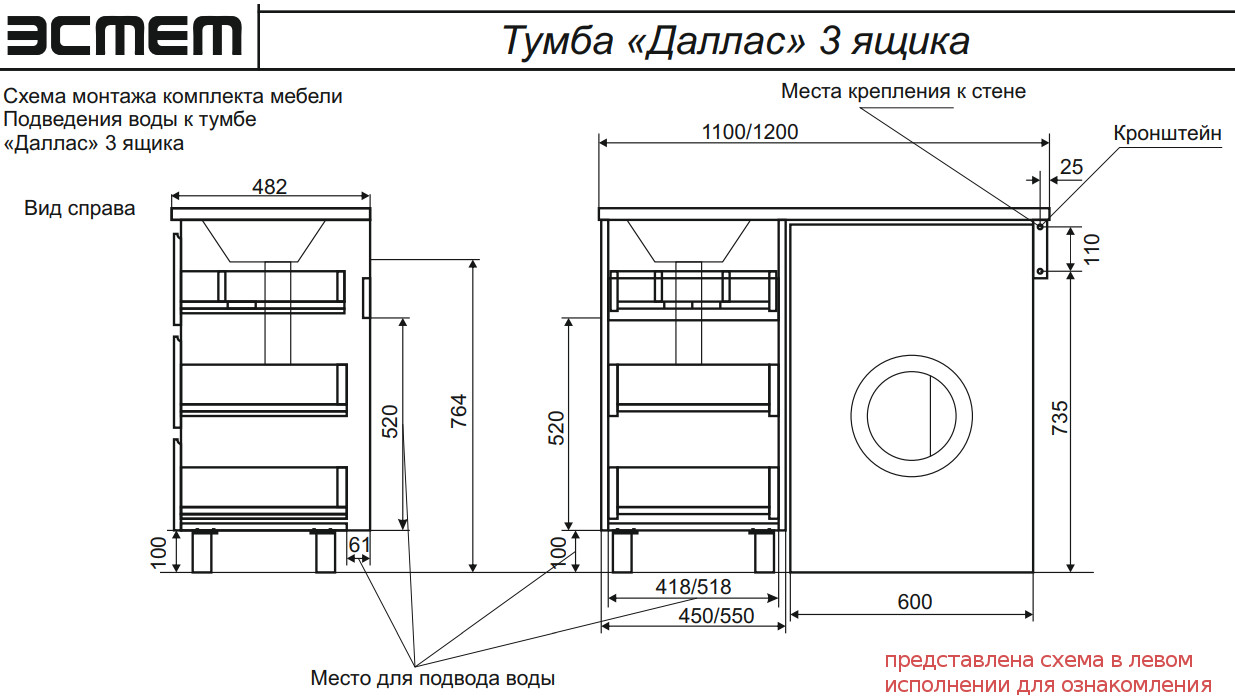 - Тумба с раковиной Dallas Luxe 1100 напольная 3 ящика правая