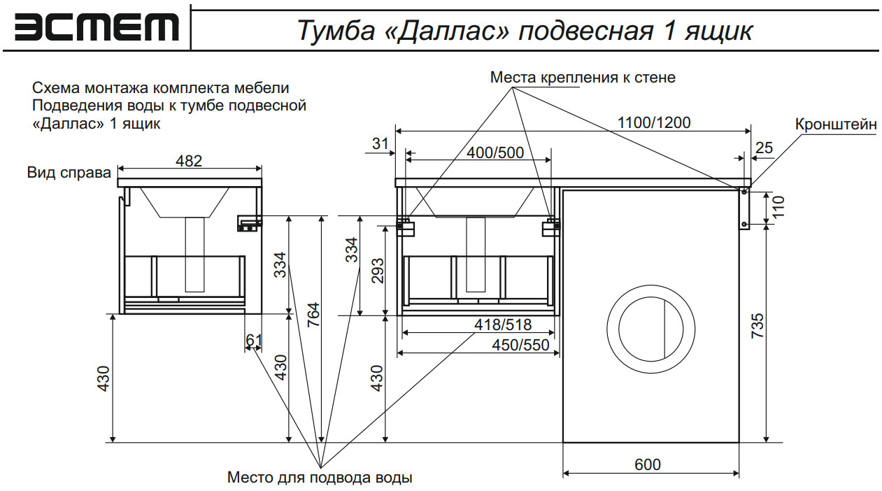Тумба с раковиной Dallas Luxe 1100 навесная 1 ящик левая