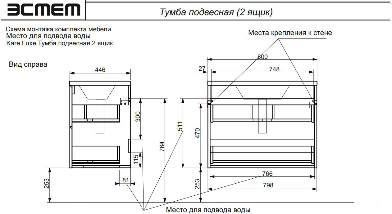 - Тумба с раковиной Kare Luxe 800 навесная 2 ящика