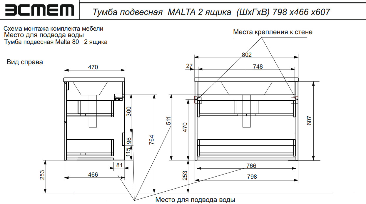 Тумба с раковиной Malta 800 навесная 2 ящика