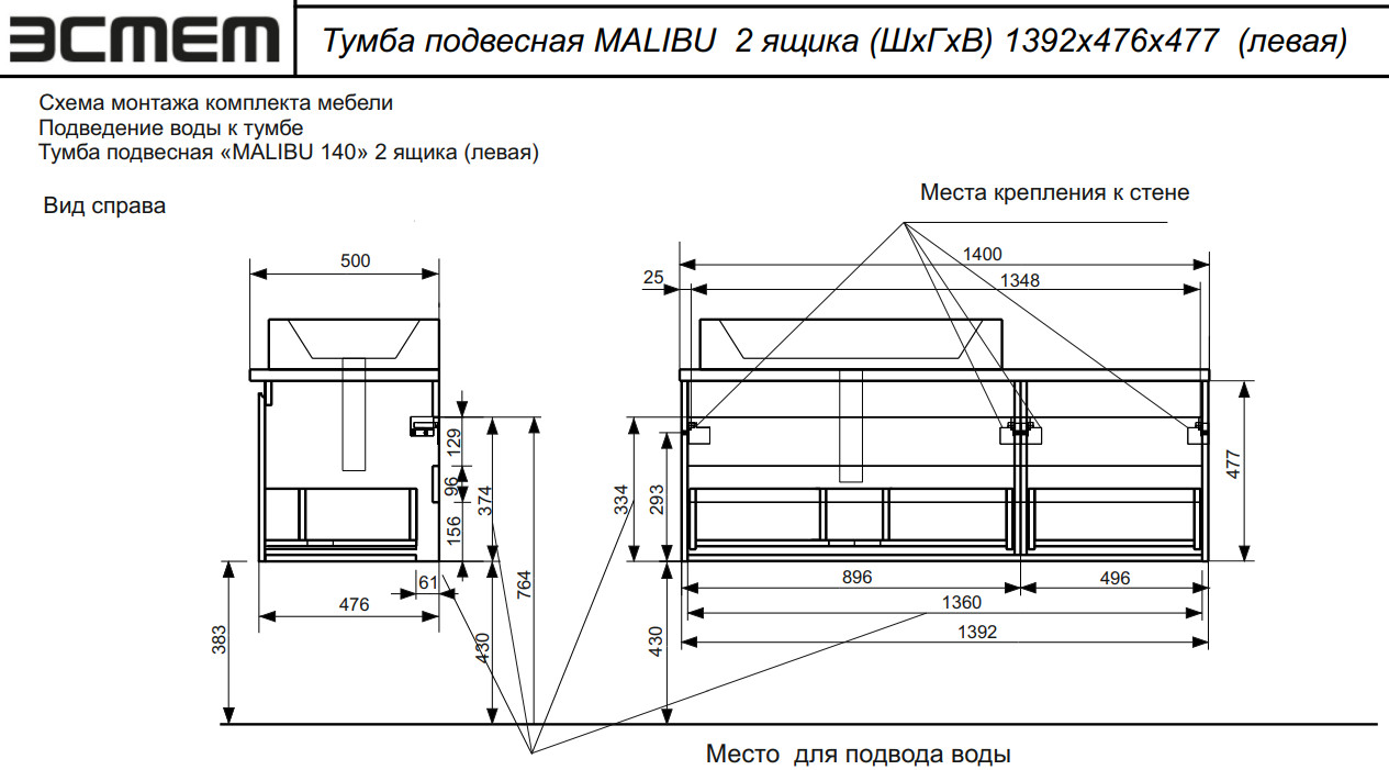 - Тумба с раковиной подвесной Malibu 1400 левосторонний 2 ящика со вставкой массив