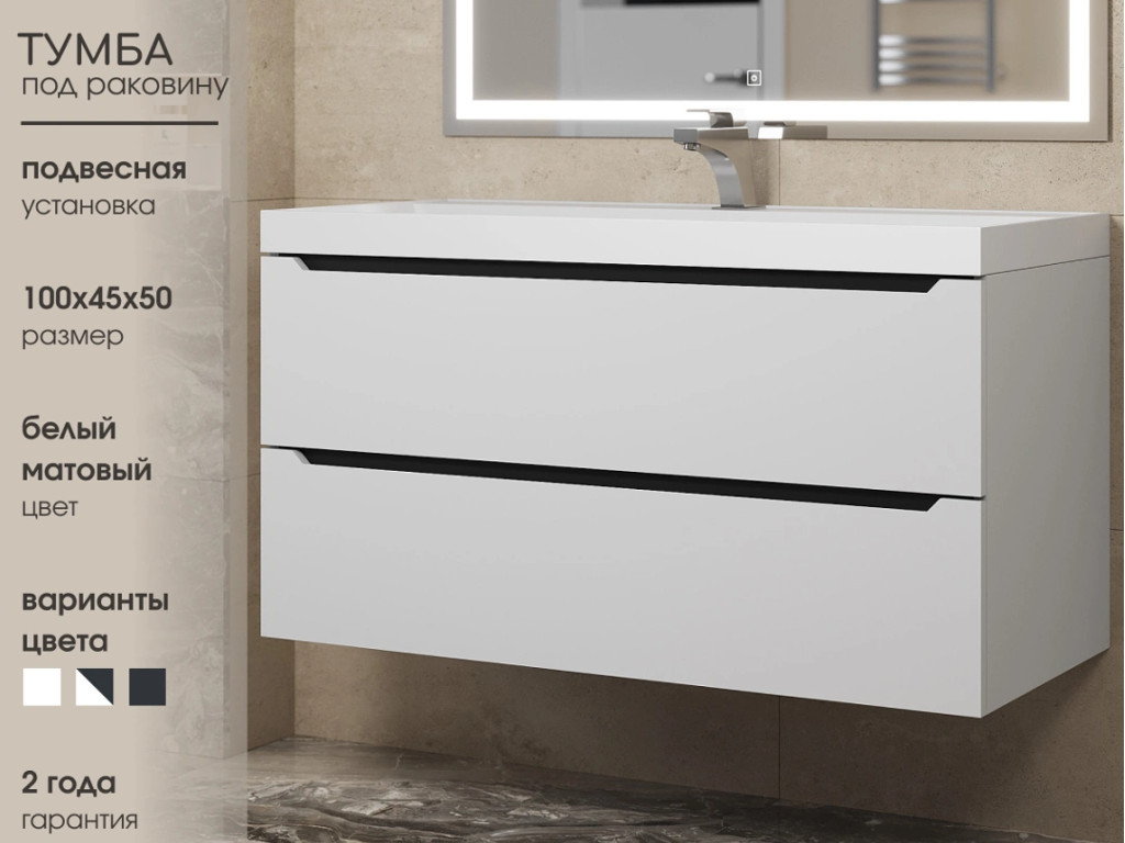 - Тумба с раковиной Uperwood Tanos матовая белая/графит 100 см