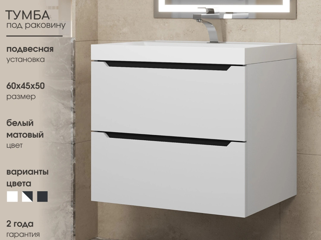 - Тумба с раковиной Uperwood Tanos матовая белая/графит 60 см