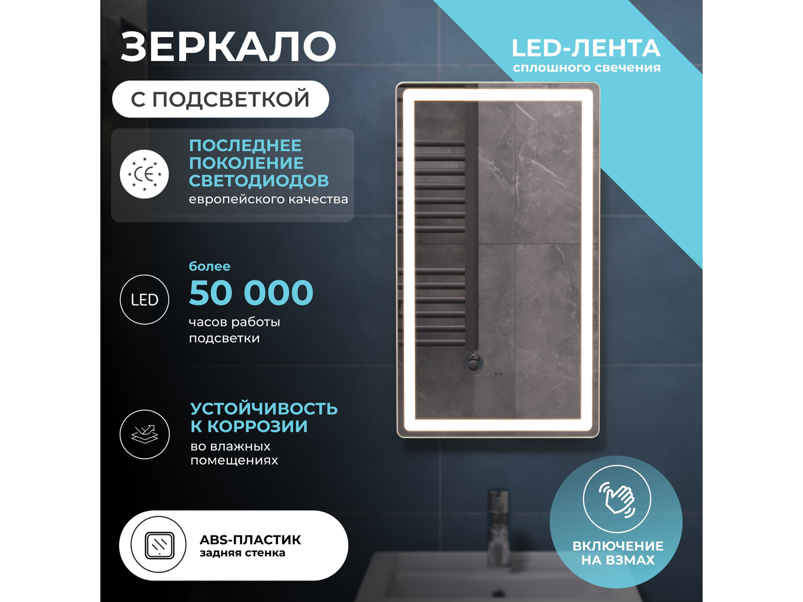 Подсветка фронтальная по периметру, с цветовой температурой 5000К – нейтральный белый, управление подсветкой бесконтактный выключатель «на взмах»