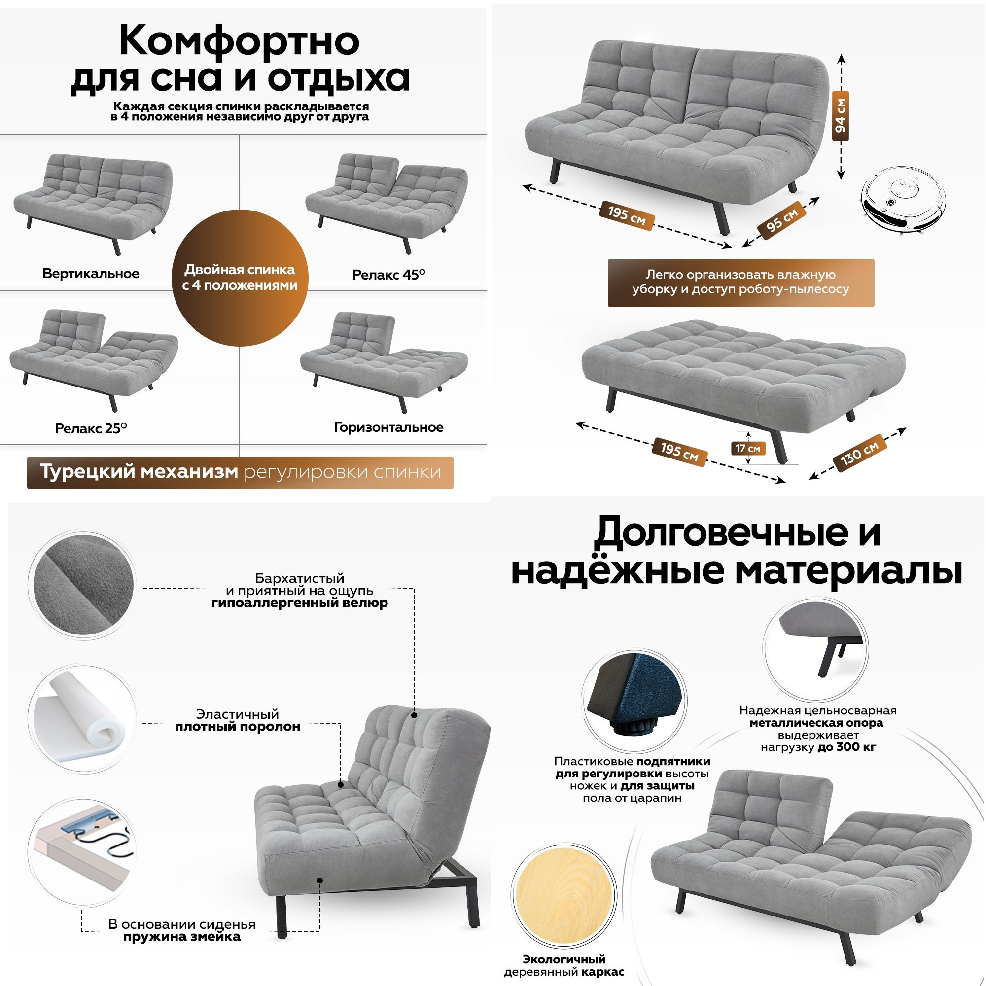 Встроенный механизм «клик кляк» позволяет трансформировать диван в 3 положения: