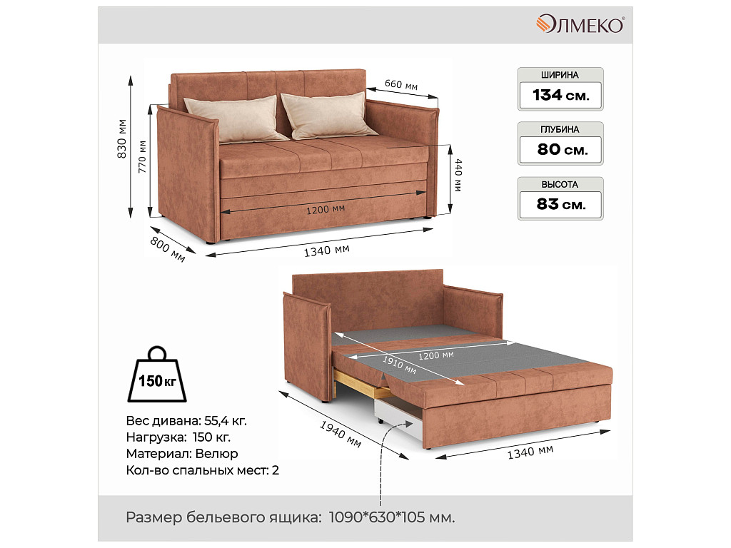 Диван Дэнди велюр тенерифе корица/велюр тенерифе крем