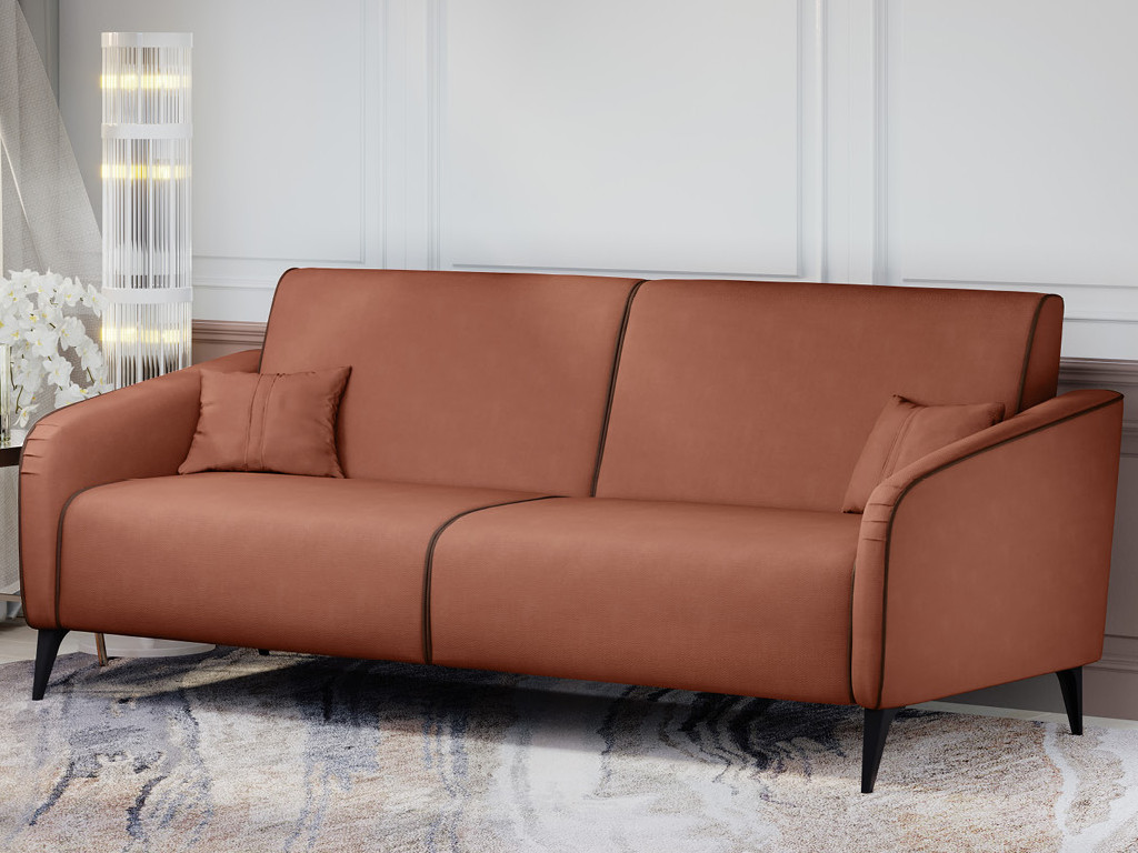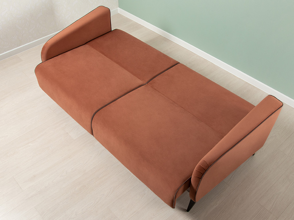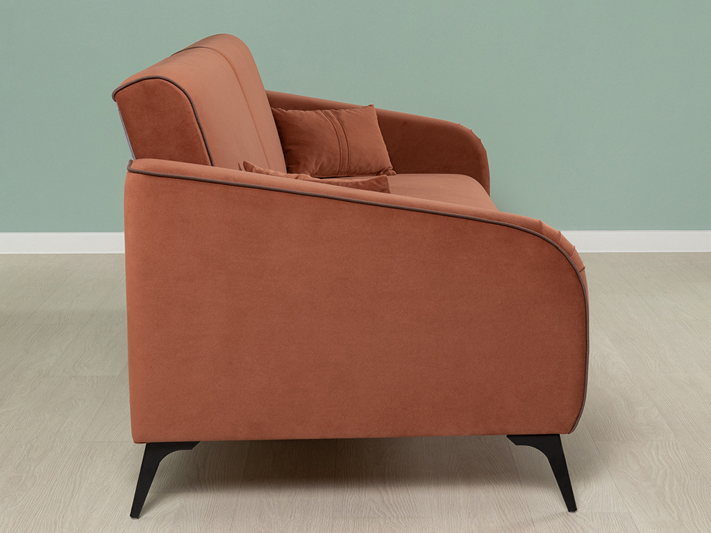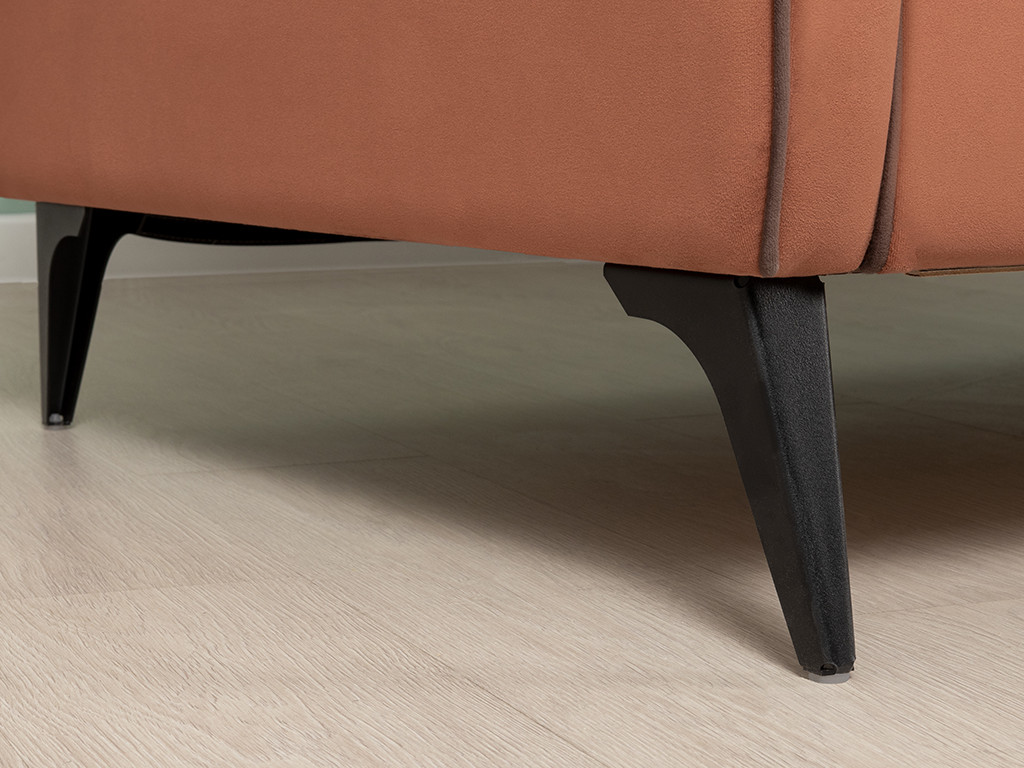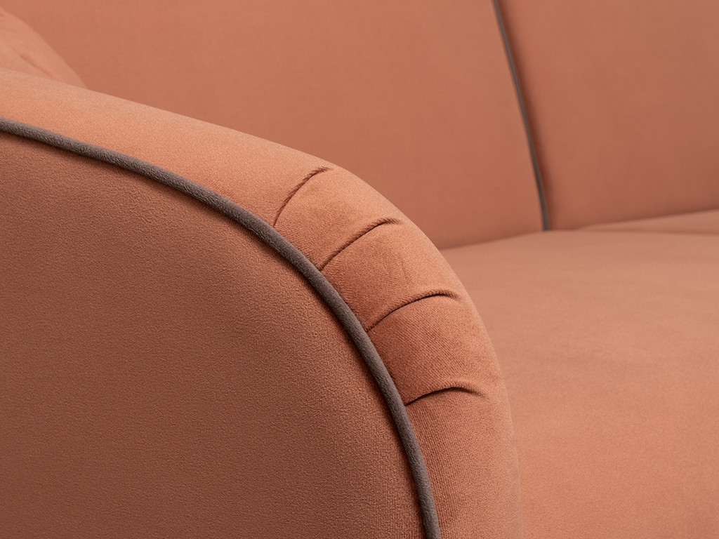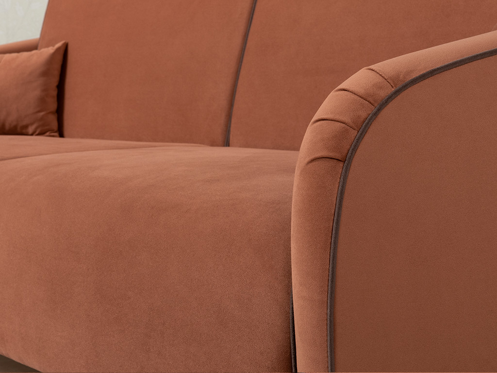 Декор: Спинка и сиденье разделяются пополам двойным кантом по центру и одинарным по краям сидения, для придания одной единой формы. Подлокотники с изгибом на лицевой стороне и мягкими закругленным углом со складками, с выраженным контрастным ровным кантом по внешнему контуру изделия и изогнутой линией канта.