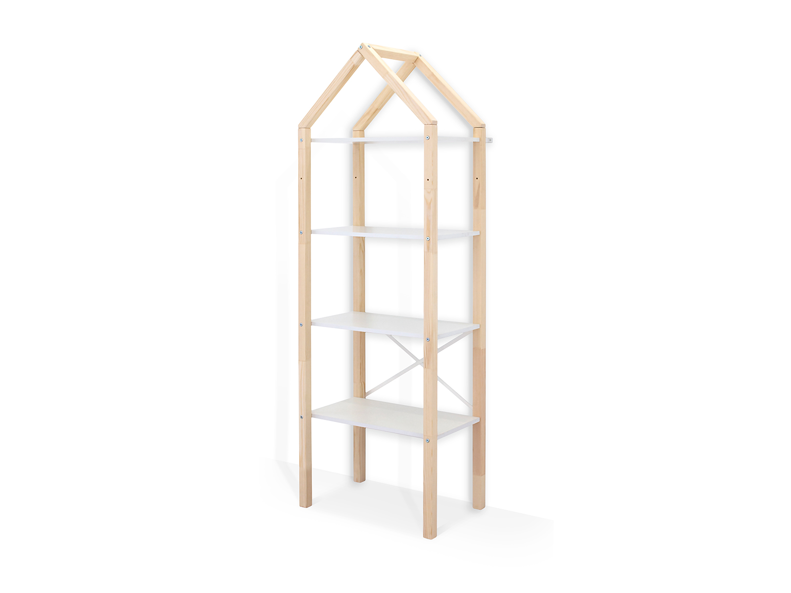 Короб для хранения приобретается отдельно!Стеллаж стоит на 4ех ножках. Для устойчивости конструкцию детского стеллажа можно прикрепить к стене с помощью специального уголка, который идет в комплекте. Стеллаж сконструирован так, что его можно использовать в двух вариантах – с четырьмя полками или с вешалом и одной полкой. Все необходимое для двух вариантов сборки стеллажа идет в комплекте. Крышу домика при желании можно снять.