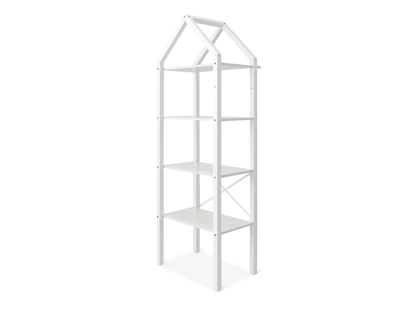 Короб для хранения приобретается отдельно!Стеллаж стоит на 4ех ножках. Для устойчивости конструкцию детского стеллажа можно прикрепить к стене с помощью специального уголка, который идет в комплекте. Стеллаж сконструирован так, что его можно использовать в двух вариантах – с четырьмя полками или с вешалом и одной полкой. Все необходимое для двух вариантов сборки стеллажа идет в комплекте. Крышу домика при желании можно снять.