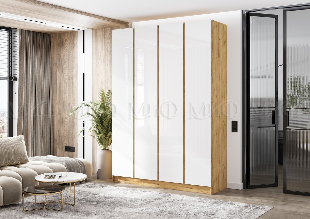 - Шкаф четырехстворчатый Келвин (1600) Белый Глянец, Дуб Крафт-вставка дуб крафт