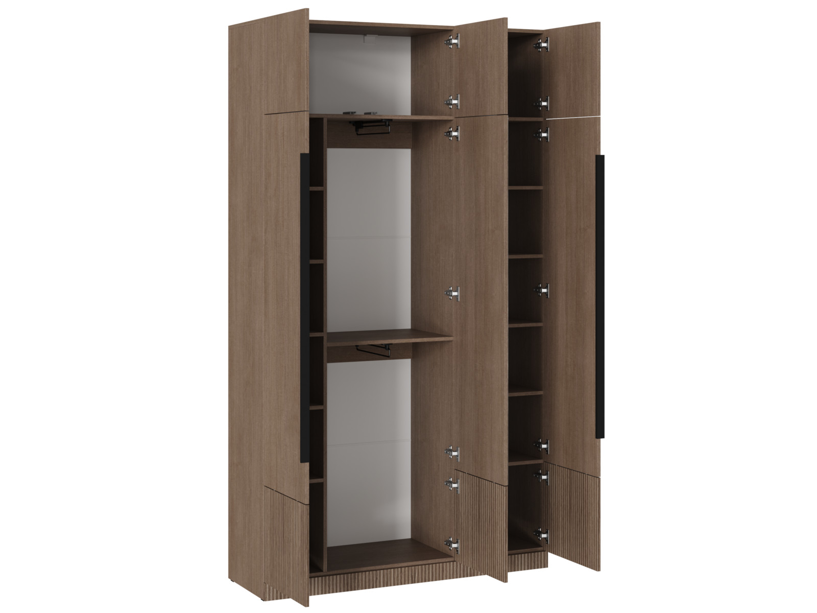 В центральной части шкафа расположена вязка для крепления к ней выдвижной вешалки. Выдвижная вешалка крепится и к верхней вязке. Нагрузка на вешалку 5 кг. Ниши с вешалками равнозначные по габаритному размеру Д.600 х В.943 х Г.426 мм.