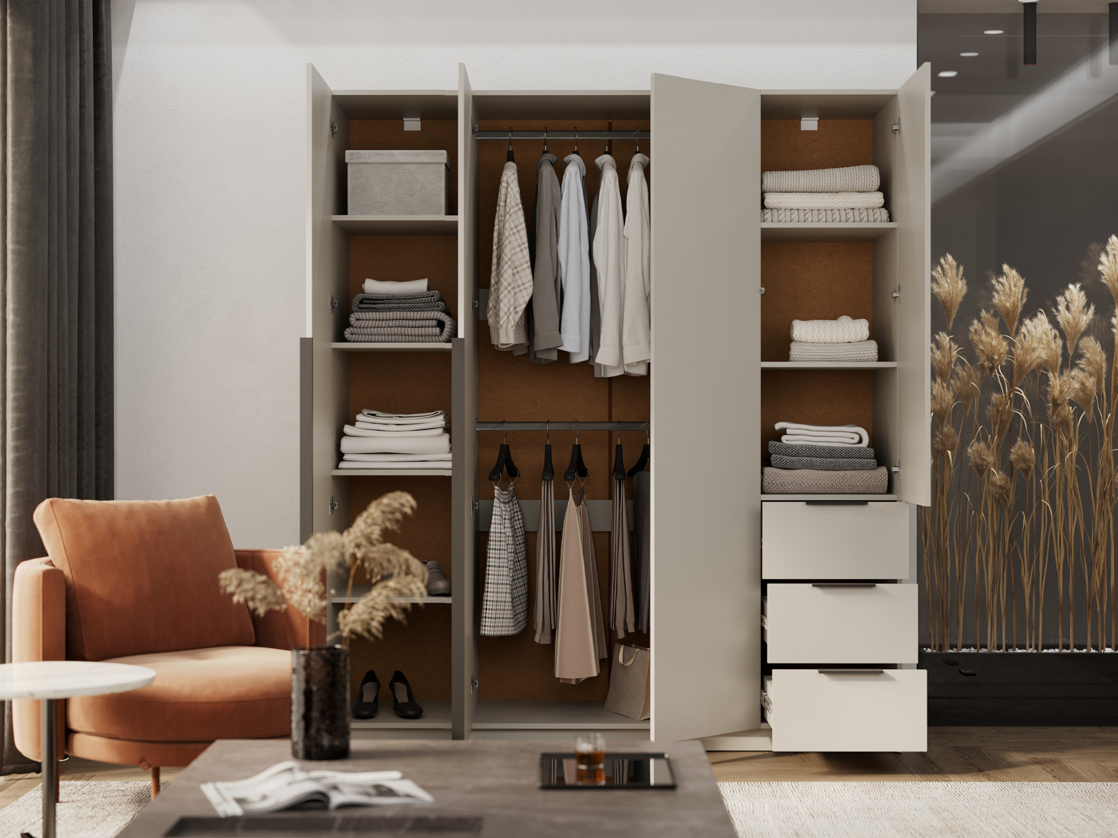 - Правые створки – без ручек. Крайняя правая – открывание при помощи Отталкивателя для дверей.