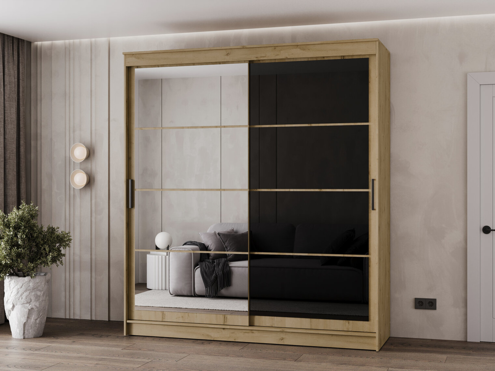 - Шкаф-купе Гранд-1 2000 Дуб Вотан-двери Зеркало-Лакобель черный