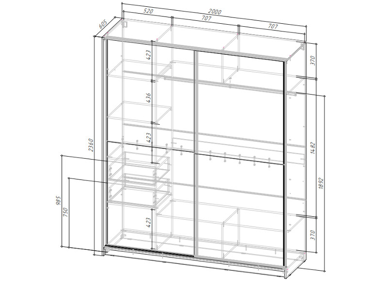Габаритные размеры: Д.2000 х В.2360 х Г.605 мм.