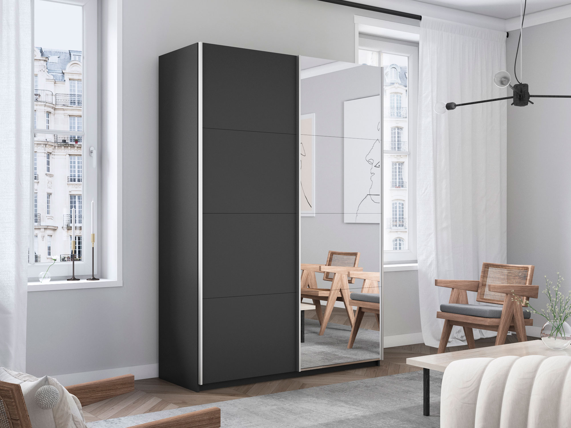 - Усиленная навесная система дверей помогает ходовому профилю выдерживать высокие нагрузки, а также сохраняет полезную площадь внутри шкафа, благодаря установке снаружи корпуса