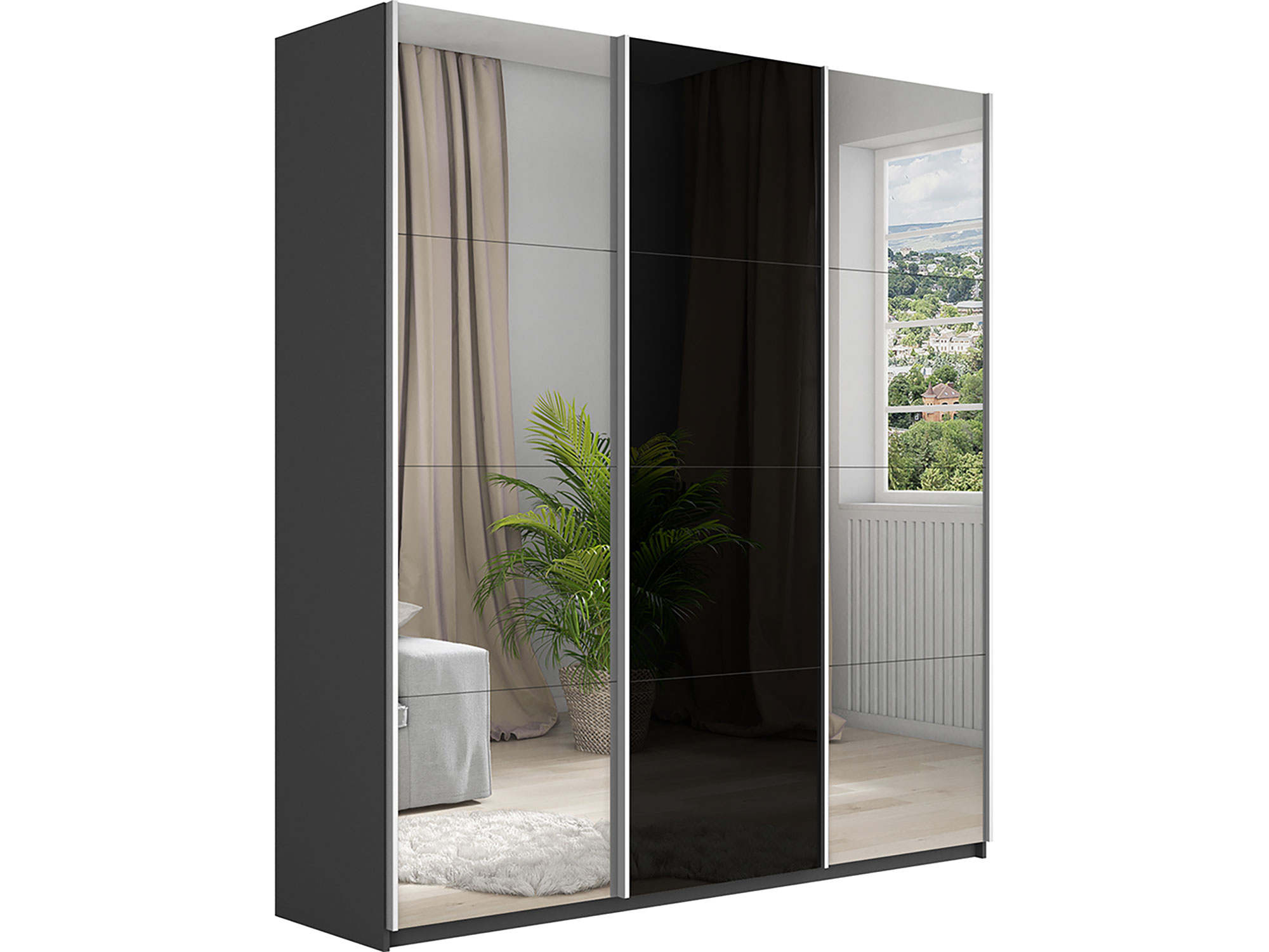 - Шкаф-купе Прайм Широкий 3-х дверный два зеркала/стекло черное Серый Диамант