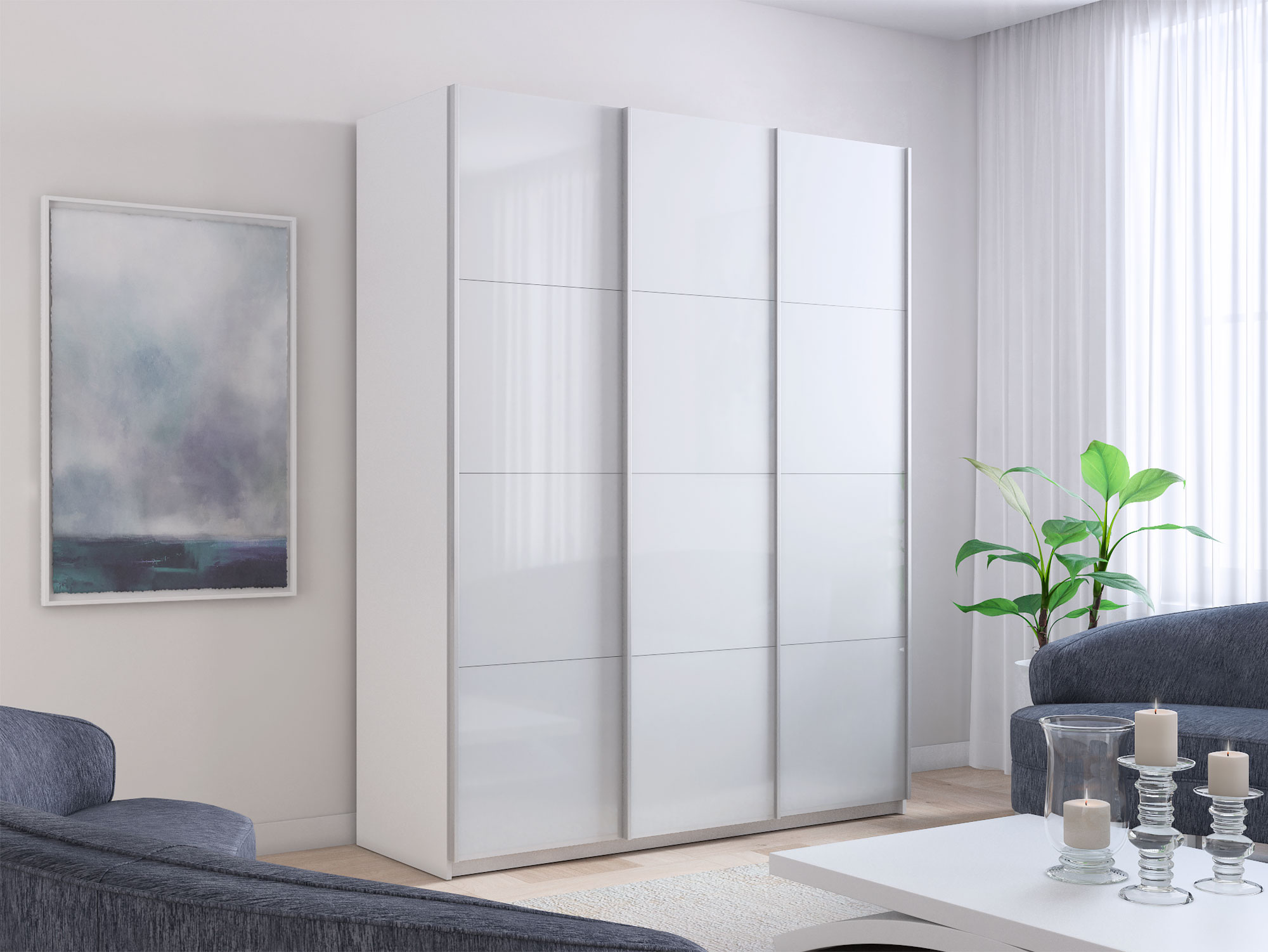 - Шкаф-купе Прайм Широкий 3-х дверный три белых стекла Белый Снег