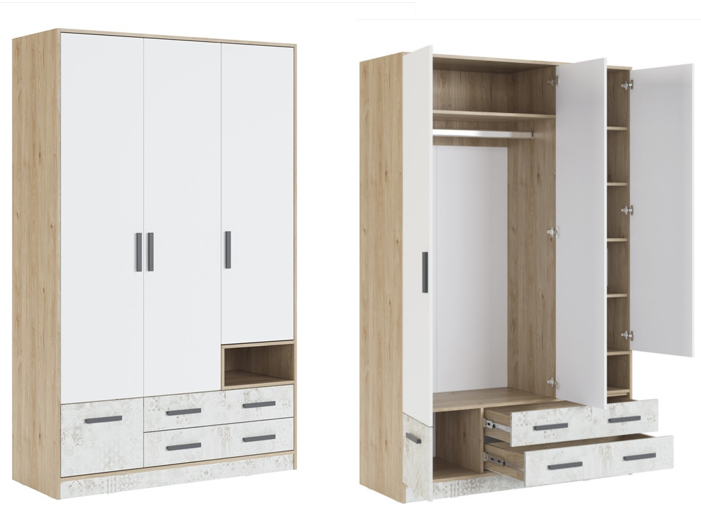 - Шкаф имеет три отделения, два выдвижных ящика на шариковых направляющих полного выдвижения и открытую нишу.