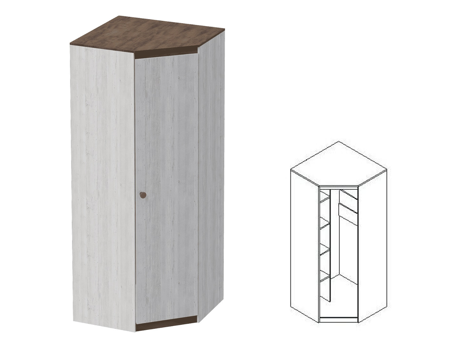 Состоит из двух отделений: 1- для белья с четырьмя полками; 2 - платяное с одной полкой и штангой для одежды