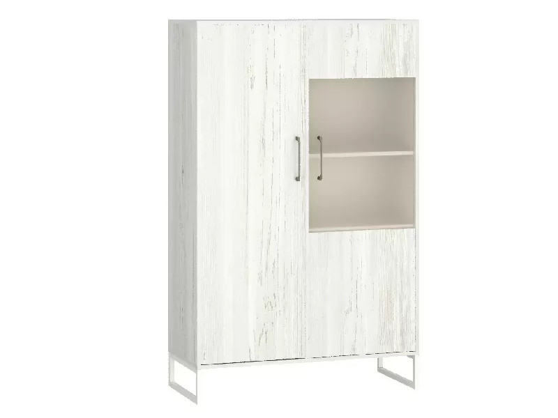 Шкаф имеет универсальную сборку и вставку из белого матового стекла. Внутри него находится десять больших полок.