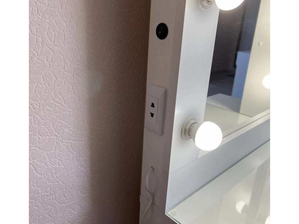 - Встроенные выключатель и розетка на торце зеркала слева. Питание 220W. Сетевой шнур с вилкой 2 метра (слева).