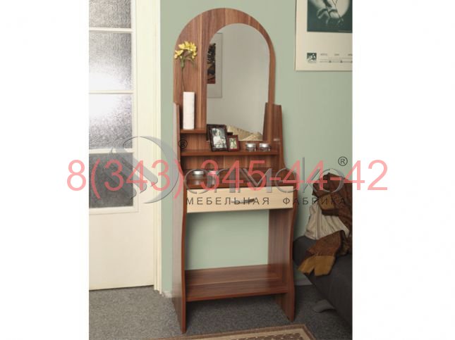 Фигурное зеркало сверху, под ним - открытые полки. Под столешницей - выдвижной ящик, снизу-полка.