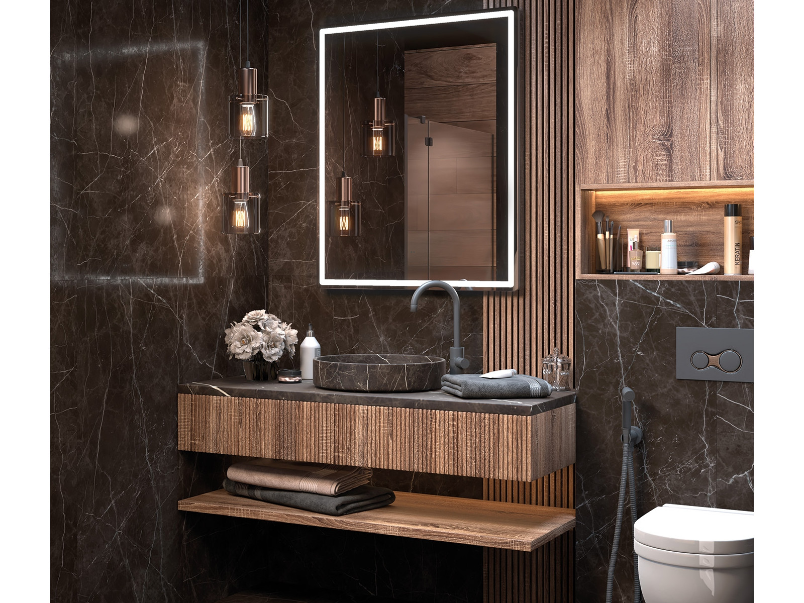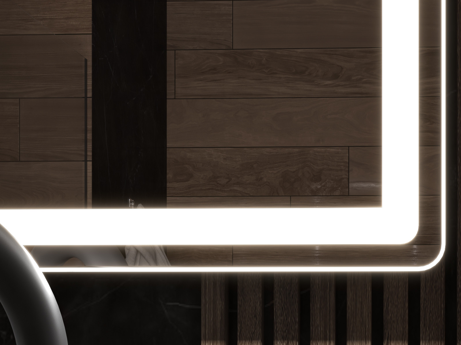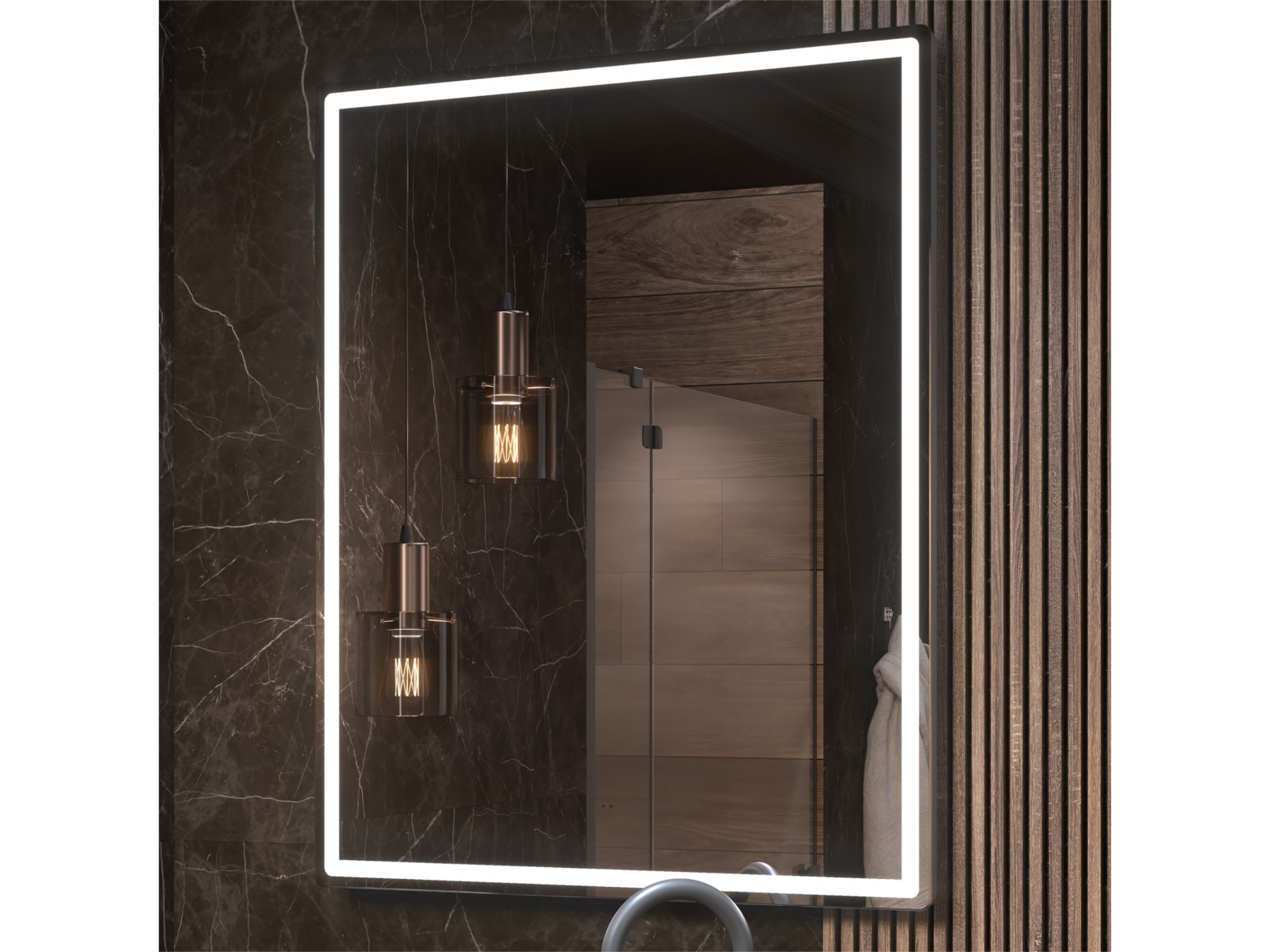 светодиодная подсветка по периметру; сенсорное управление; антизапотевание; включение на взмах